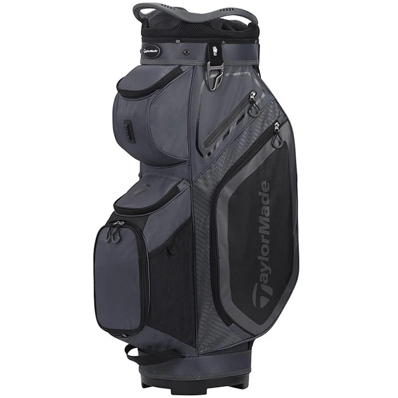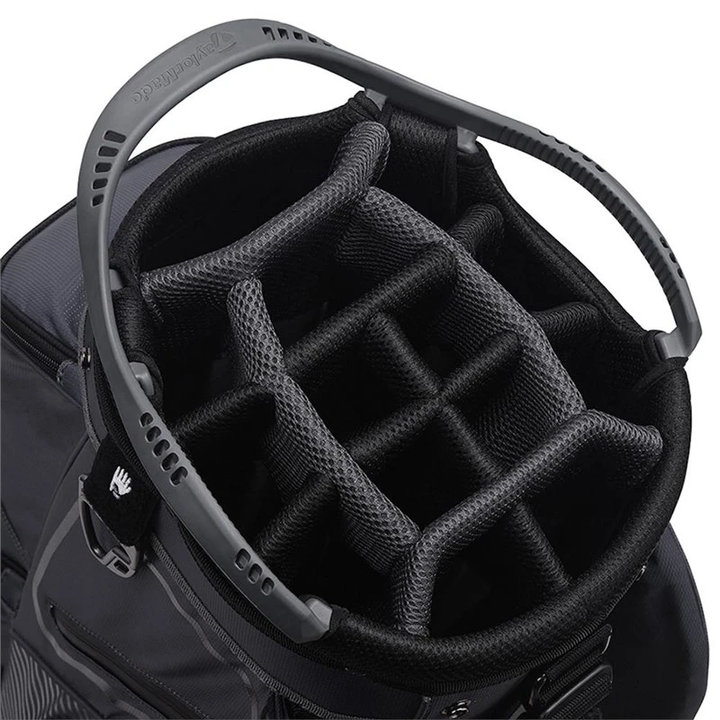 | TaylorMade 2020 Pro 8.0 Golf Cart Bag The new TaylorMade Pro 8.0 cart bag is a fantastic all rounder featuring a lightweight design with exceptional value for money. The Pro 8.0 Cart Bag features a 10 inch 14 way divider top that provides excellent club organisation. With an easy grab lift handles, the bag can be easily lifted on and off any golf trolley or buggy. Featuring 8 pockets that all can be accessed while riding on a trolley, the Pro 8.0 Cart bag is packed with leading features. Weighing in at a nimble 2.5KG, the Pro 8.0 has some best selling features such as an extra large integrated putter well, 2 large garment pockets, key lock trolley base and fur-lined valuables pocket. – 10 Inch 14 Way Divider Top |